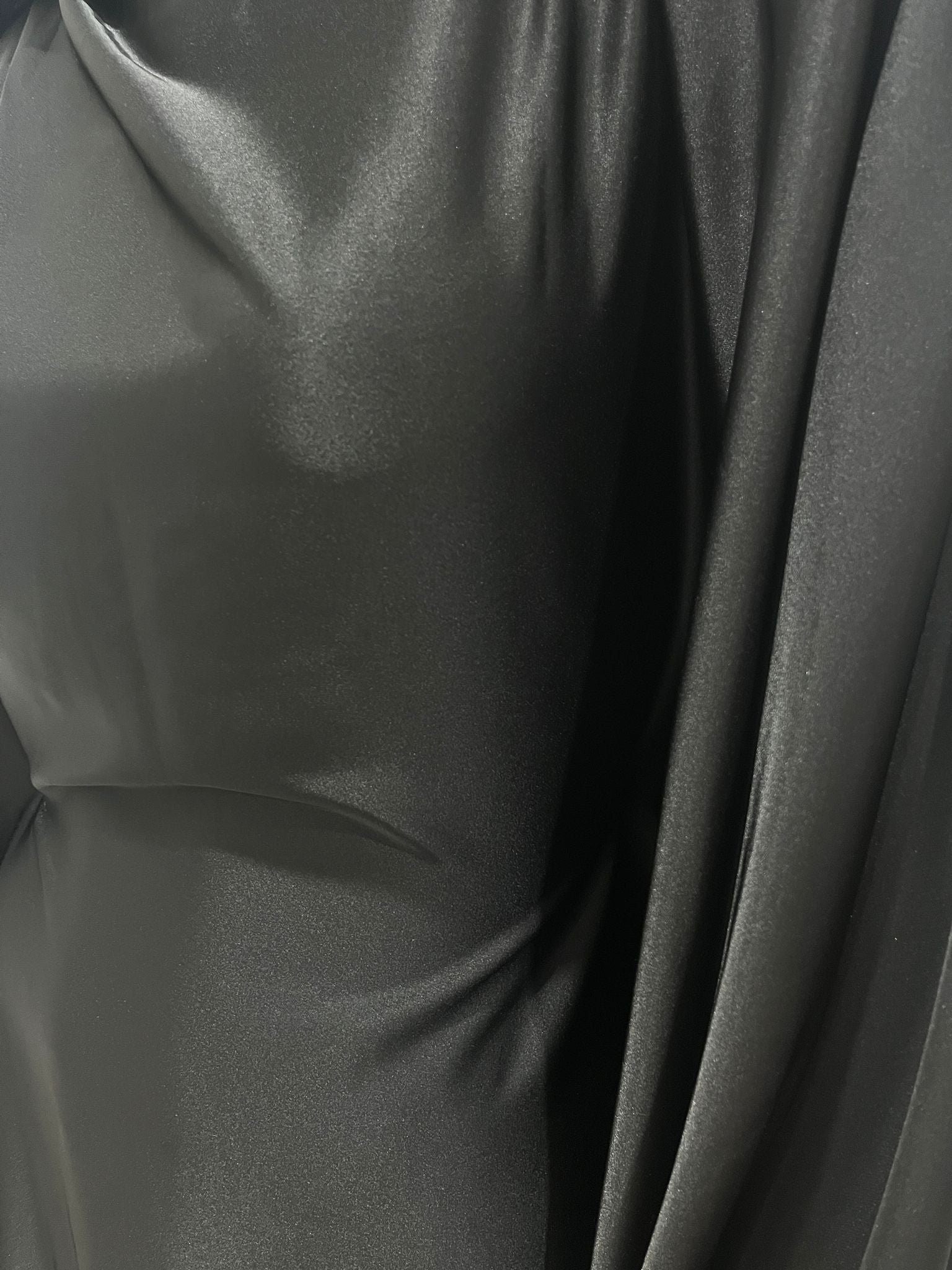 Elevate your style with this black satin butterfly abaya, featuring flowy butterfly sleeves adorned with exquisite pearl lace detailing for a touch of elegance and sophistication. Crafted from smooth, luxurious satin, the abaya drapes beautifully, offering a modest and refined silhouette.