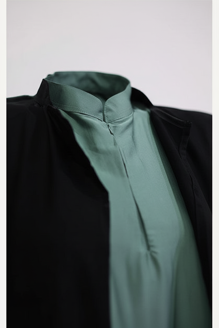 The set features a luxurious silk high neck inner dress in a soft emerald/mint tone, adding a subtle contrast and elevated finish. Completed with a matching hijab, this set offers a perfectly coordinated look suitable for both everyday elegance and special occasions.