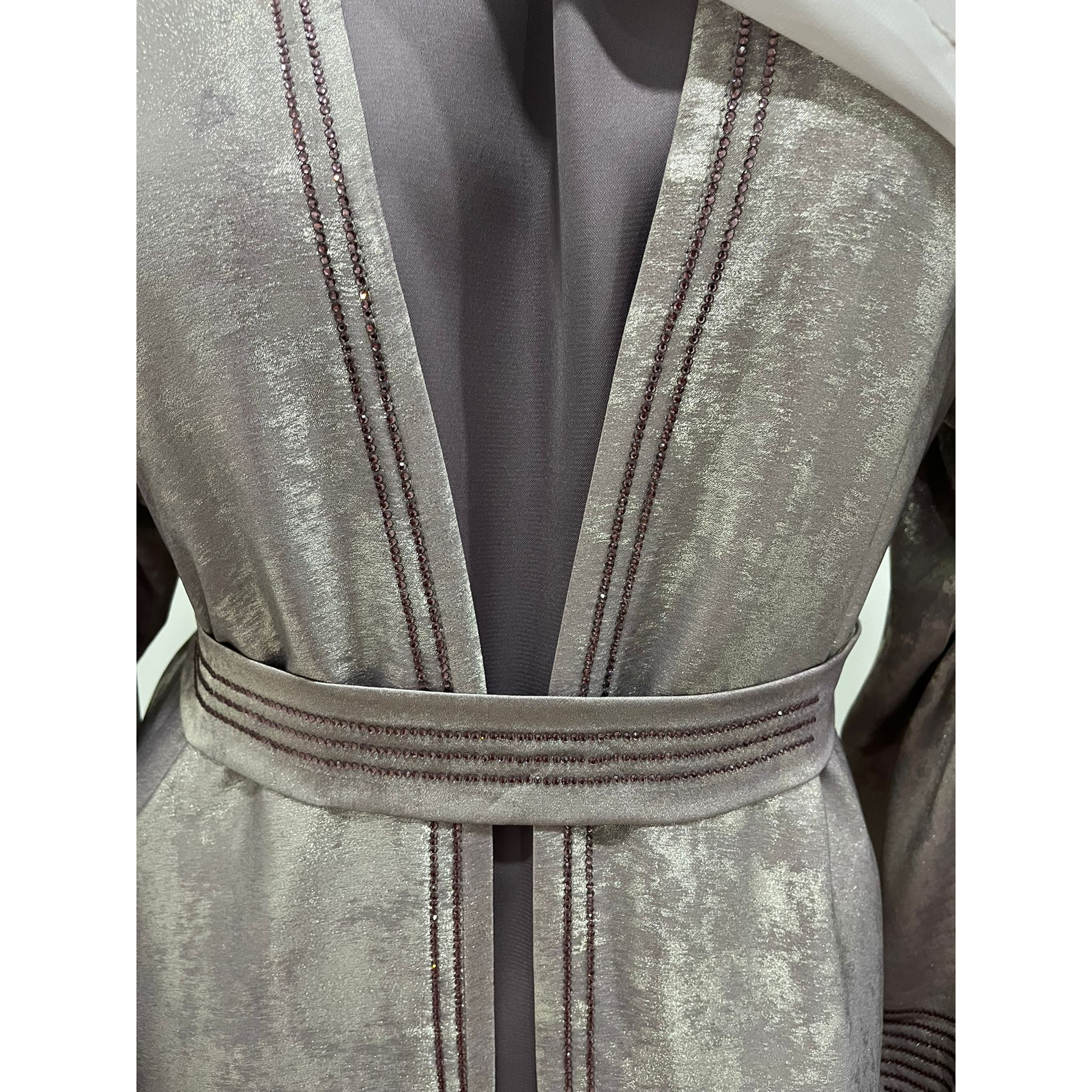 Step into elegance with our Royal Violet Foil Abaya, a stunning 3-piece set designed for timeless modesty and refined glamour. The abaya features a shimmering purple foil fabric outer that adds a luxurious glow, layered over a nida fabric inner for breathable, all-day comfort. A matching hijab completes the look, making this set perfect for special occasions and effortless styling.